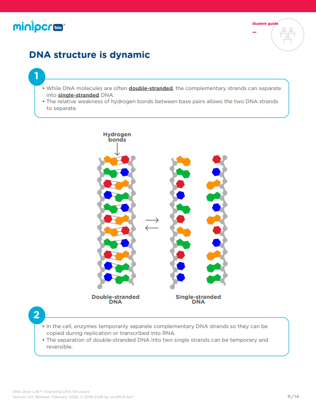 DNA structure and complementary base pairing are essential concepts in biology, but there are very few, if any, authentic hands-on lab activities to engage students with this content. The DNA Glow Lab from miniPCR bio lets you move beyond static DNA models and visualize DNA in action!